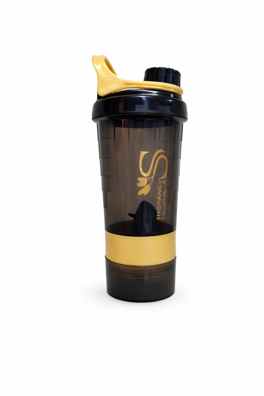 شيكر رياضي عشان يسهل عليه خلط المكملات الغذائيه وكمان فيه مكان تخزن فيه مكملات كبسول او اقراص تحت او حتى مكان لاسكوب يتنقل معاك في كل مكان